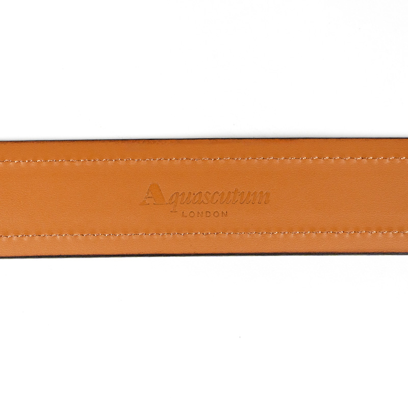 バックル部分にはアクアスキュータムの象徴である、クレストの刻印を施しているため、ワンランク上の高級感あるベルトに仕上げました。