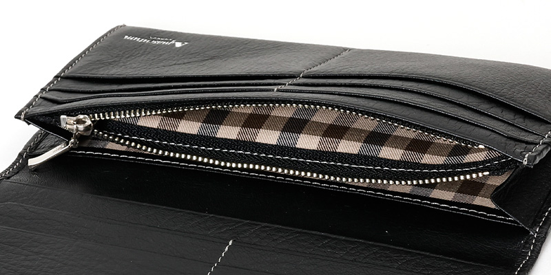 小銭入れや札室の内装にはアクアスキュータムの象徴であるクラブチェックを使用しています。